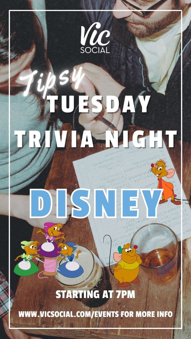 Join Keshia for live hosted Disney Themed Tipsy Trivia! Bring your team, or just yourself and your cell phone and get connected to digital Tipsy Triva. Live hosted trivia from 7-8 against others in our restaurant, from 8pm - 10pm for trivia against bars across North America. The questions are displayed on our TV monitors and you simply answer on your cell phone using the Buzzfeed trivia app. Prizes every week!