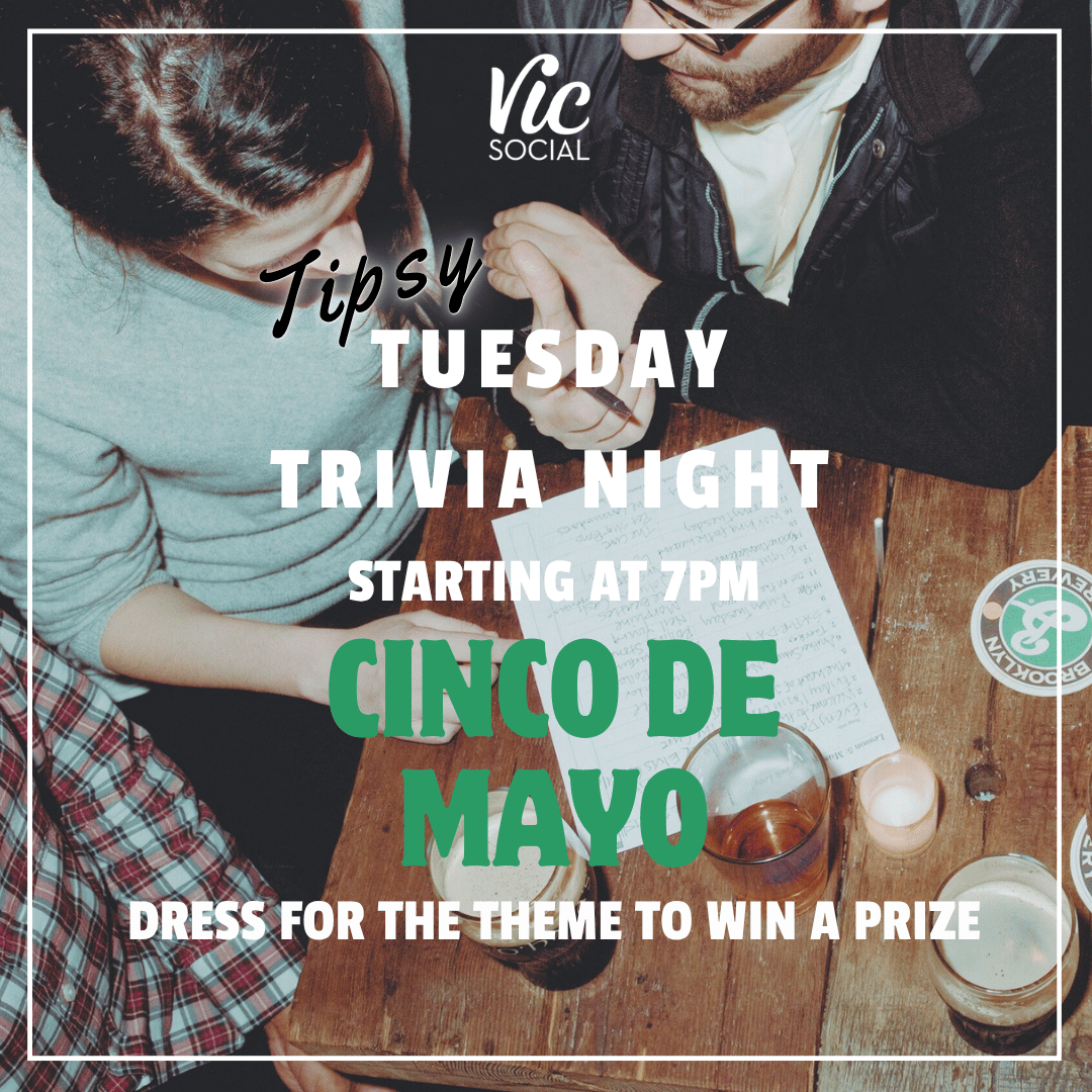 Join us on Tuesday, May 5 to celebrate Cinco de Mayo with themed Trivia and 50% off of our tacos, Chips and Guac, and Margaritas from 7-8pm! Come in wearing any Mexican themed clothing during Trivia and receive a 50% off coupon as a reward!